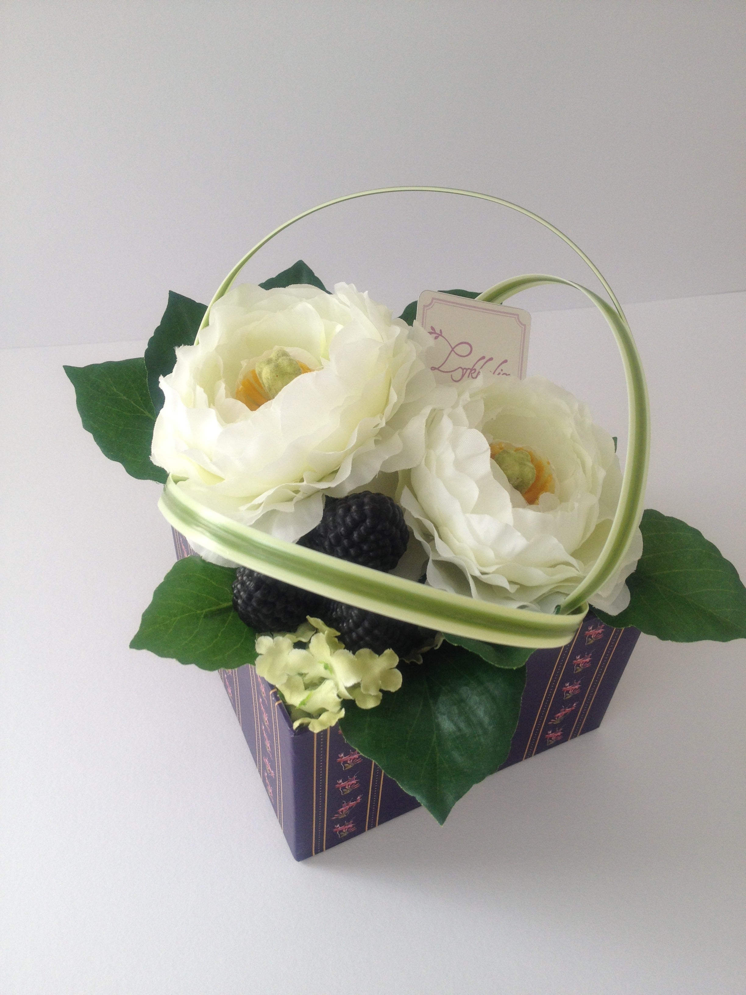 花柄の紺のboxに、白いラナンキュラスとベリーのコントラストが素敵なアーティフィシャルフラワーアレンジです。グリーンのアーチが効いています。