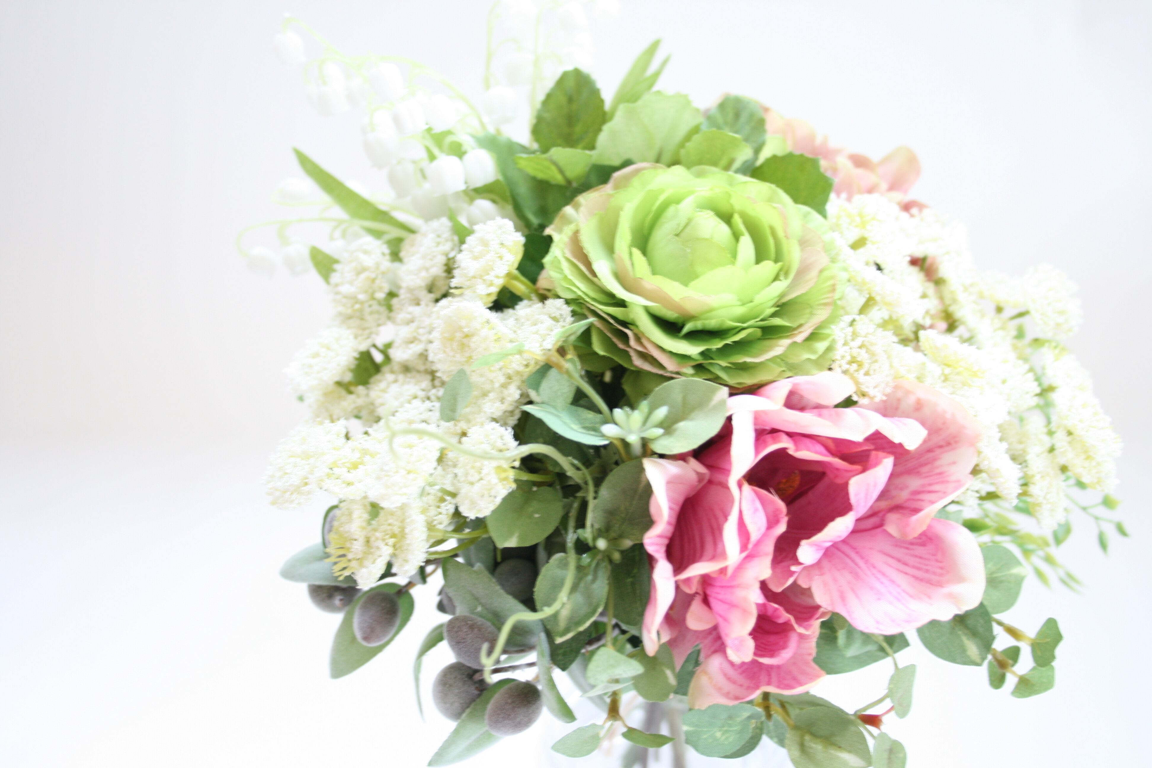レースフラワーやスズラン、アジサイやオリーブなど良質なアーティフィシャルフラワーを使用したナチュラルな雰囲気のブーケスタイルです。
