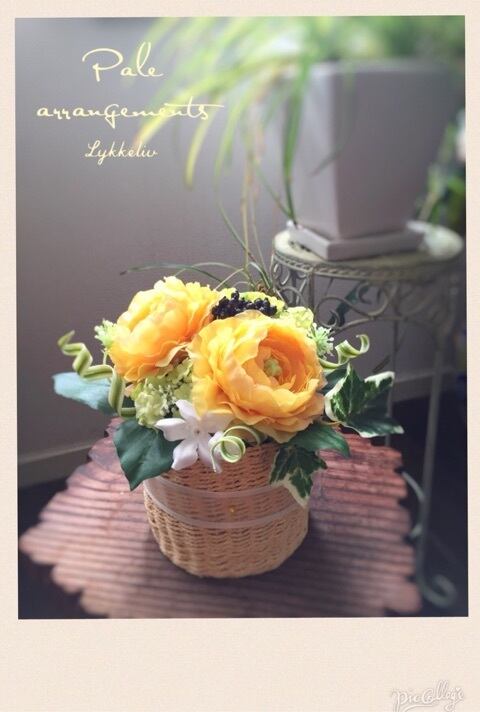 元気の出る黄色いのラナンキュラスを使用したアーティフィシャルフラワーアレンジです。