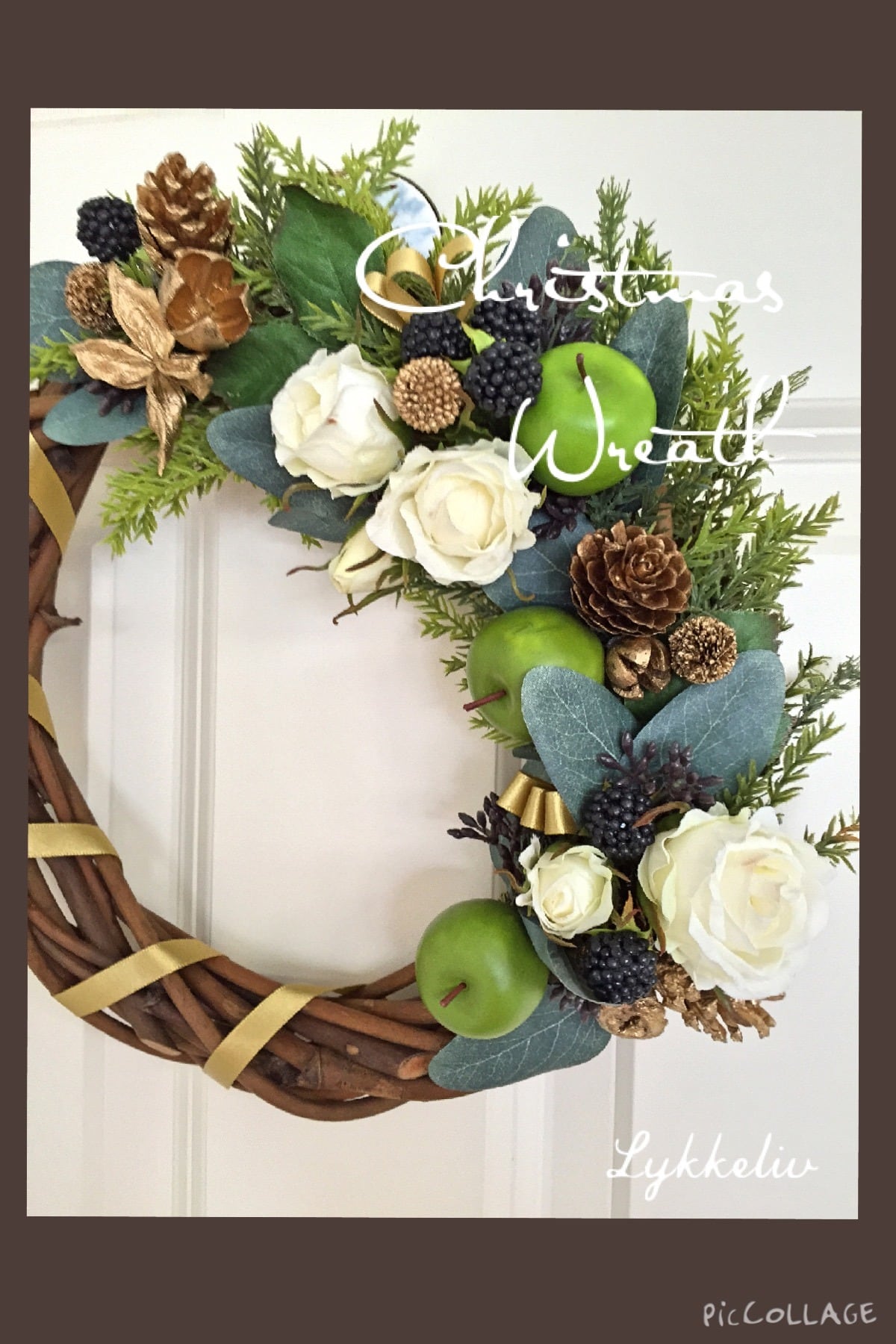 ホワイトグリーンにゴールドを加えたモダンナチュラルなリースです。飾る場所を選ばず、モダンな場所にも、ナチュラルな場所にも飾って頂けます。